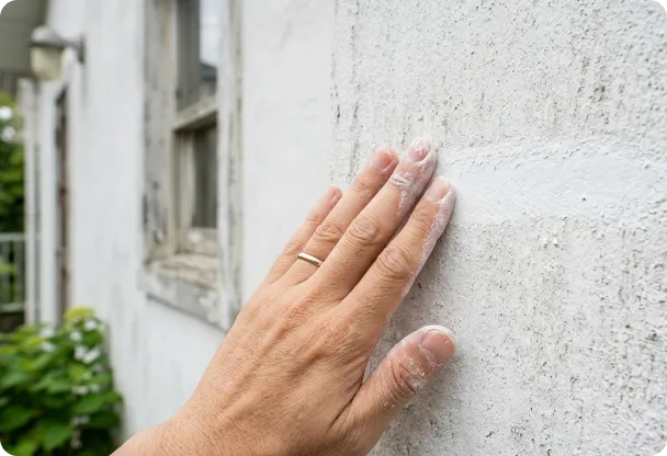 壁を触ったときに手に白い粉がつく状態。塗料の樹脂が分解されています。